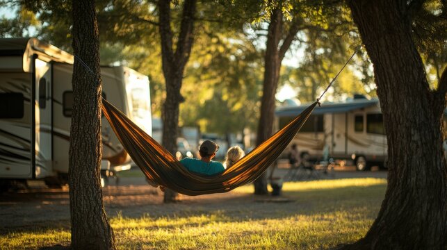 Couple relaxing in hammock near RVs