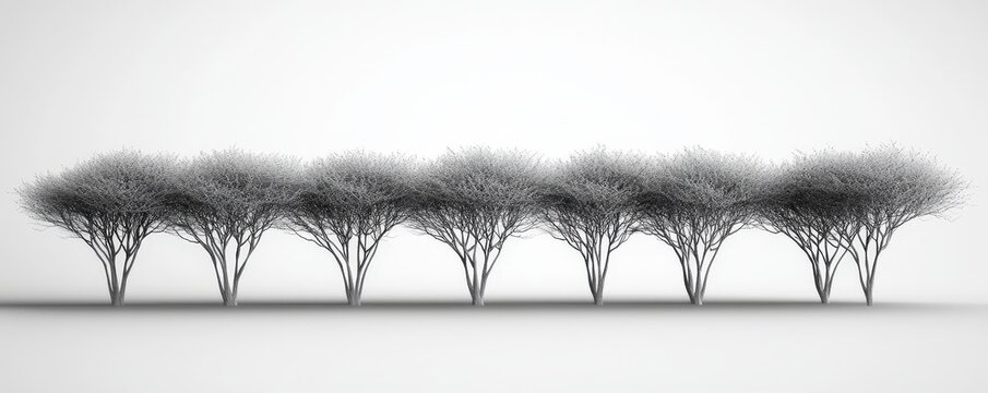 A cluster of bare trees stands tall against a clear blue sky, their gnarled branches reaching out in intricate patterns, creating a striking silhouette in the tranquil landscape.