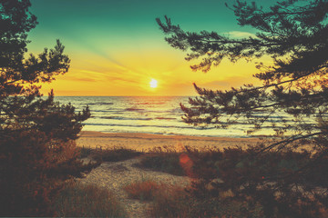 Beautiful sunset over the sea. Pine trees on the seashore