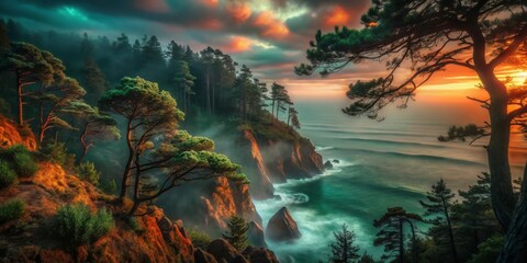 Sunrise over a rocky coastline with pine trees