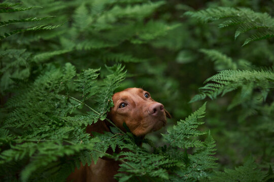 a red dog in a fern. Hungarian Vizsla in nature. Pet in the forest