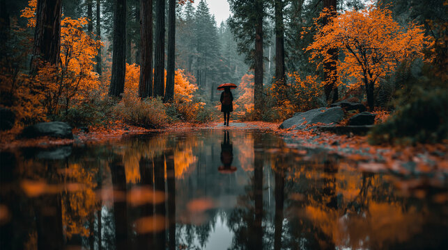 Autumn walk with umbrella and reflections in the forest