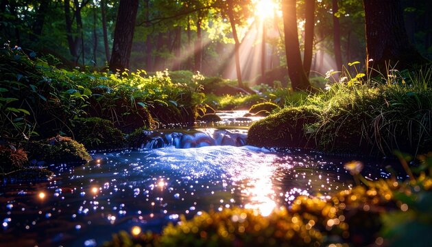 Enchanting panoramic forest scenery showcases soft light filtering through the foliage, creating an ambiance of tranquility as a serene stream flows gently within the enchanting forest scenery.