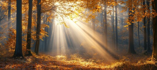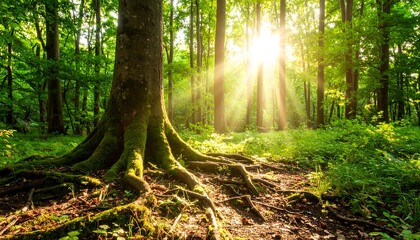 Sunlight streaming through dense forest canopy in tranquil wilderness