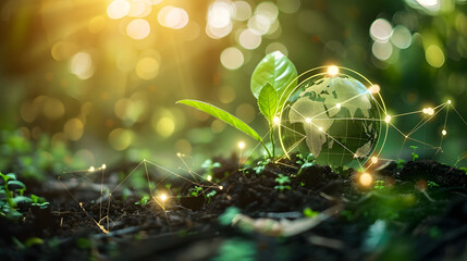 Earth globe nestled in lush foliage, intertwined with digital connections, representing global interconnectedness and environmentalism