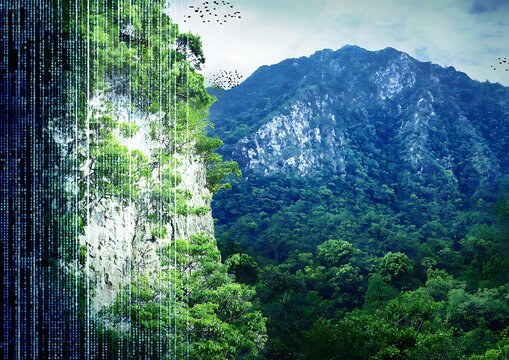 Lush jungle landscape with digital grid overlay, showcasing technology and nature integration effectively