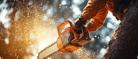 Lumberjack, using chainsaw, cutting tree trunk, outdoor forest scene, action shot, copy space