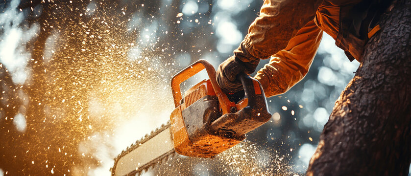 Lumberjack cutting tree with chainsaw, emphasizing safety in forestry