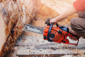 Man worker cutting trees using portable gasoline chainsaw in the forest. Wood industry, sawmill, woodcutter.