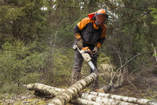 Forestry worker is measuring trunk of pine to analysis and research about growth of tree in forest. Natural resource monitoring.