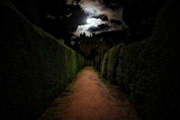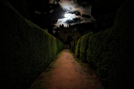 Scottish castle photographed by the park in the moonlight