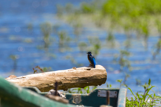 Common European Kingfisher (Alcedo atthis) perched on a stick above the river and hunting for fish. This sparrow-sized bird has the typical short-tailed, large-headed kingfisher profile.