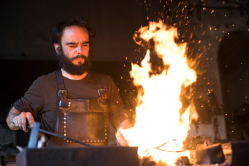 Blacksmith working with fire in workshop