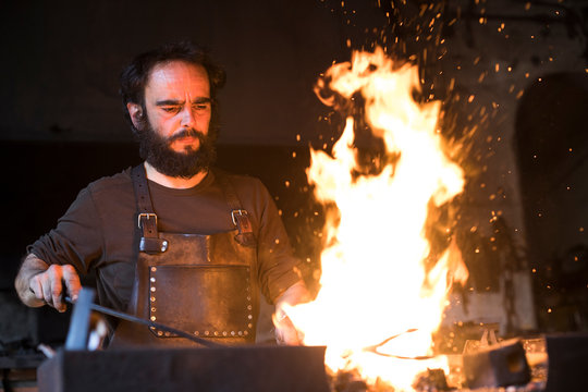 Blacksmith hard at work heating iron in fiery forge