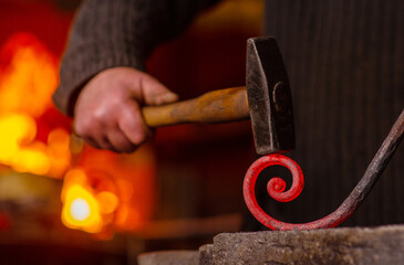 Close-up of the hands of a blacksmith twisting a spiral with a hammer, putting a red-hot iron blank on an anvil. Work in the forge
