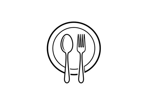 Simple Black and White Illustration of Cutlery and Plate