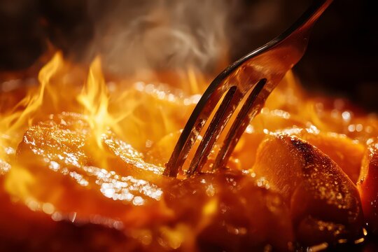 Fork piercing tender pork slice on dark background