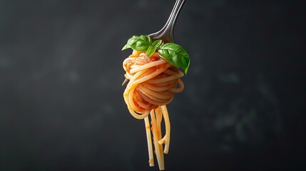 Close-up of a fork twirling spaghetti with marinara sauce, highlighted by basil.