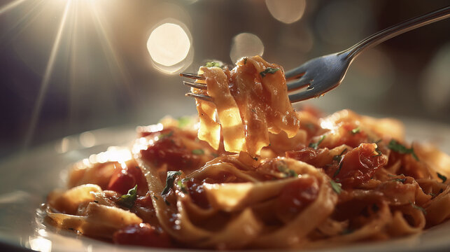 A fork lifts a portion of fettuccine pasta from a plate, coated in a vibrant red sauce with herbs. The texture of the pasta and sauce is highlighted under the warm light. This image emphasizes pasta