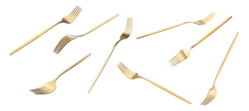 Shiny golden forks isolated on white, set