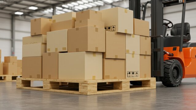 Stacked boxes on a pallet with forklift in a warehouse, ready for shipment.