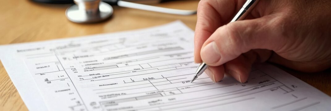 Hand completing a medical form at a healthcare facility during regular office hours. Generative AI