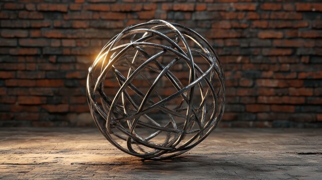 An abstract kinetic sculpture made of interlocking metal elements forming a sphere against a brick wall background