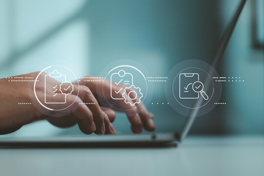 Digital document review and approval interface floating above typing hands on modern laptop.