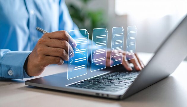 Person efficiently manages documents online using a laptop to digitally sign forms for business tasks and streamlined workflow.