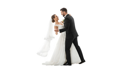 Romantic wedding couple embracing and looking at each other in formal attire isolated on transparent background