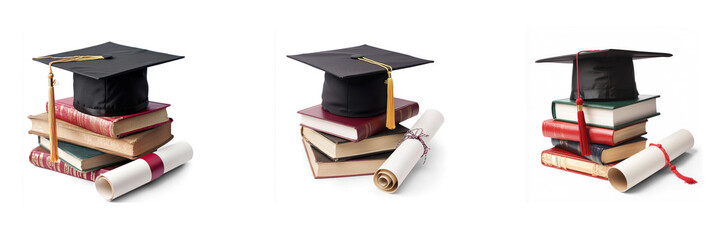Collection of graduation cap resting on a stack of books, with the diploma rolled up beside it. isolate on transparent background