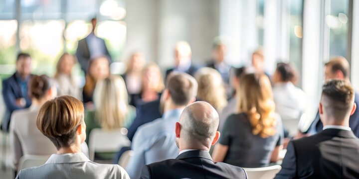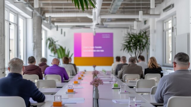 A group of people sitting in a classroom or conference room setting, attentively watching a presentation at the front. The image captures a moment of learning and attention.