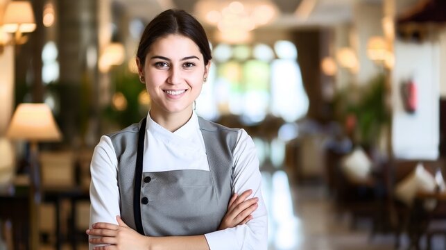 Smiling woman in formal uniform standing with arms crossed in a well-lit, elegant restaurant or hotel lobby.