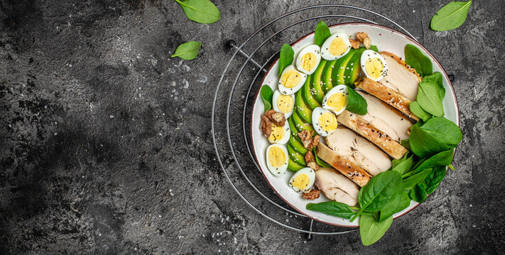 ingredients for a ketogenic diet avocado, grilled chicken fillet, quail egg, spinach, walnut. Healthy fats, clean eating for weight loss, Long banner format. top view