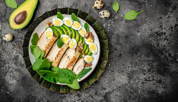 toast with avocadoo, salmon and spinach, nuts on a wooden board. Long banner format. top view