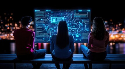 Business professionals assessing financial data with technology interface