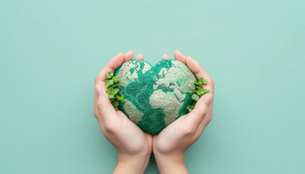 Hands forming heart shape around glowing Earth, symbolizing love for planet, global unity, environmental protection, sustainability, world peace, and human connection with nature