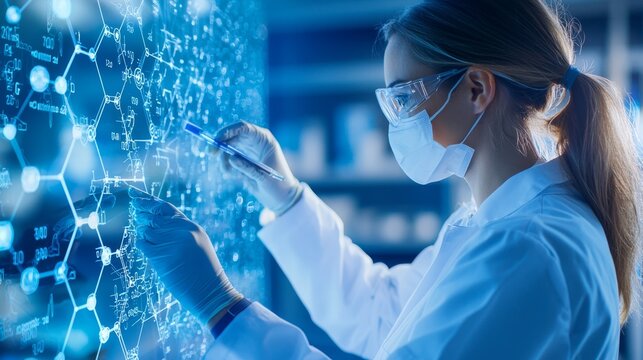 Female scientist wearing a lab coat and gloves, analyzing a futuristic interactive display with chemical formulas and hexagonal patterns.