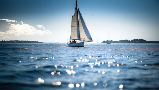 voilier de type goélette toutes voiles dehors en mer entre de petites iles, prise de vue au ras de l'eau