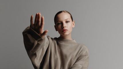 Focused woman gazing intently against blue wall