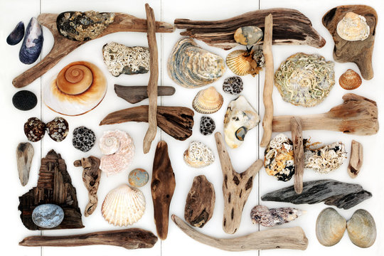 Abstract Beach Art. With seashells, driftwood and pebbles forming a background.