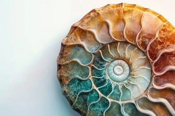 A mesmerizing ammonite fossil showcasing vibrant teal, orange, and brown hues in a spiral pattern.