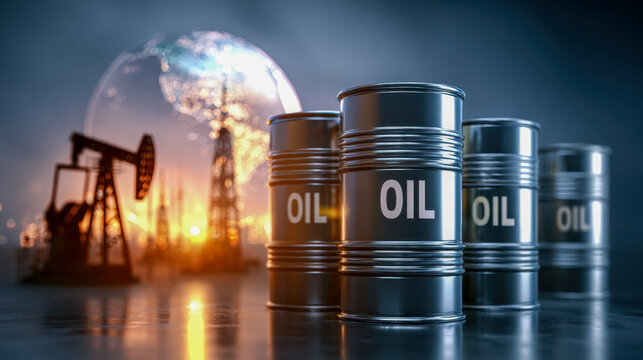 Row of black metal barrels labeled oil in foreground with silhouetted oil pump jacks and glowing globe representing global petroleum industry concepts at sunset