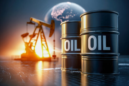 Oil barrels in the foreground with a pumpjack and illuminated globe in the background symbolizing global energy production and the petroleum industry at sunset