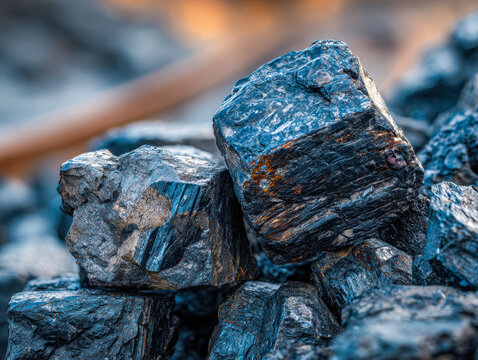 Close-up of shiny black coal chunks with rough texture stacked together in natural lighting highlighting their glossy and rugged surfaces