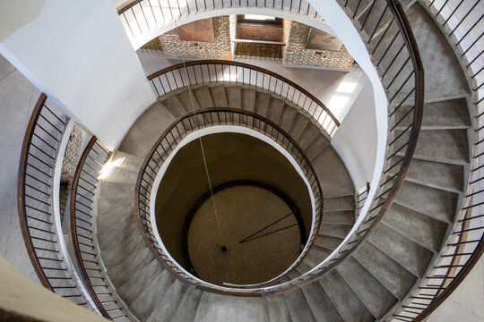 Stairs and Foucault's Pendulum suspended within the belfry or Radziejowski Tower on Cathedral Hill, Frombork. Poland