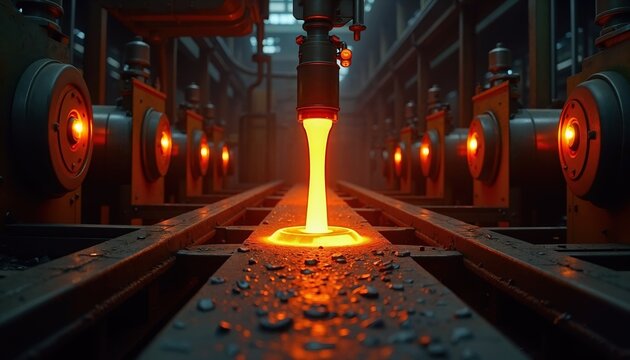 A vibrant scene of molten metal flowing from a nozzle, illuminated by warm orange light, within an industrial setting.