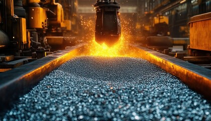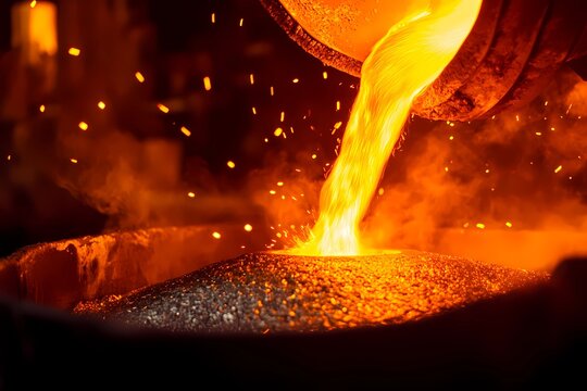 Molten metal pouring in an industrial foundry Intense heat and sparks illuminate the scene