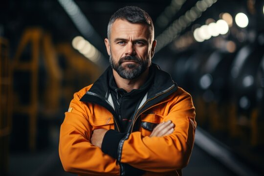 Skilled Worker in Industrial Workshop Poses Confidently With Tools in Hand