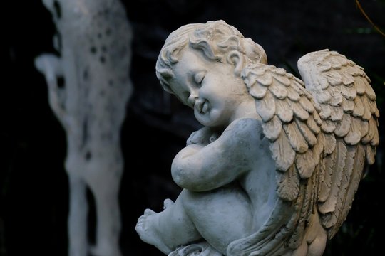 Close up a white small sleeping cupid statue with dark background and blurred a fountain in a garden area